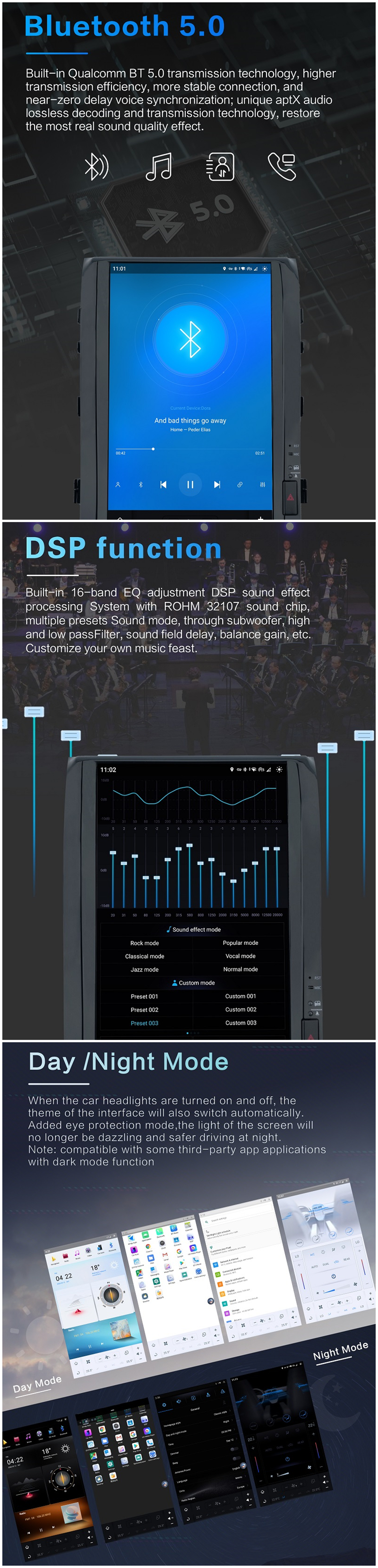 DSP Function: Built-in 16-Band EQ adjustment DSP sound effect processing system with ROHM 32107 sound chip