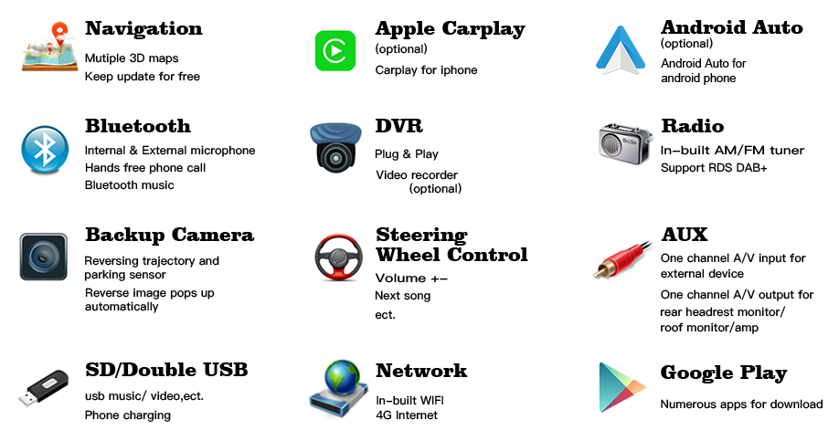 Aftermarket head unit for Kia K2/Rio 2011-2013. The same size, harness and connectors as factory radio, totall plug and play, no cutting wires. Supports factory steering wheel controls, wifi, mirror-link, SD/USB music/video, iPod, DVD playback, Bluetooth phone call and bluetooth music, backup camera(optional), DVR(optional), TV(optional), AUX port. Support Google map and preload offline map for your country on the map card so that you can use the navigaiton when there is no internet connection.